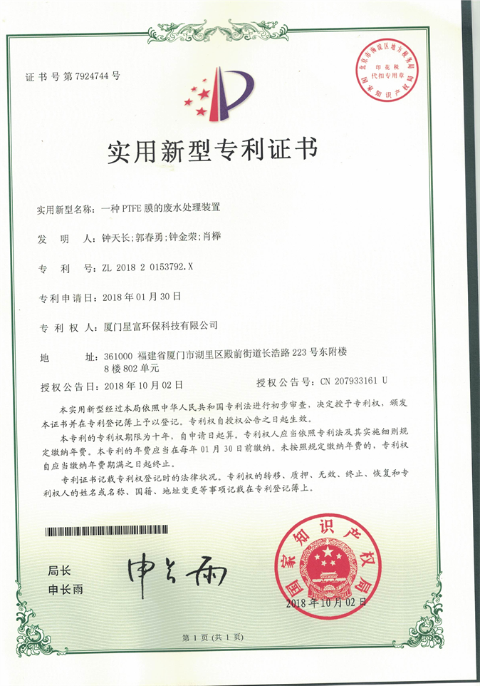 我司關(guān)于一體化PTFE-MBR系統(tǒng)污水處理設(shè)備已經(jīng)申請相關(guān)專利,并取得證書:一種PTFE膜的廢水處理裝置,專利號為ZL 2018 2 0153792.X